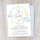Boho bébé garçon saupoudrer l'invitation avec des aquarelles bleues et jaunes d'un arc-en-ciel, soleil, coeurs, étoiles, lunes et nuages, "Oh Baby!" dans un script élégant et le nom de la future mère et les détails de la douche dans la typographie simple.