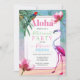 Le rose, le bleu et un mélange de couleurs tropicales qui donne l'image d'une plage rose aquarelle qui s'est fondue dans un océan et un ciel aquarellés entourés de feuilles tropicaux. Le fond est orné d'un palmier vintage et d'ananas pour compléter le look. Un panneau à bordure dorée sur le devant recouvre l'arrière - plan tropical pour encadrer vos détails de fête de retraite "Aloha". Conception composite par Holiday Hearts Designs (droits réservés).