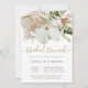 Cette invitation mariage branchée à brunch de douche nuptiale présente de magnifiques fleurs et palmiers d'aquarelle tropicale boho, des feuilles botaniques verts et du feuillage. La calligraphie en or Faux ajoute une touche élégante, et le texte principal est un boho naturel mélange de vert mousse et de brun, le tout sur un arrière - plan blanc. Le fond de l'invitation présente des graphiques plus floraux sur un simple arrière - plan blanc.