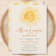 Prévoyez-vous un baby shower sur le thème du soleil ? Cette invitation à baby shower de soleil boho comporte le texte "Un petit rayon de soleil est presque ici!" avec une jolie aquarelle souriante soleil jaune sur un arrière - plan crème douce. L'arrière est décoré d'un motif solarium. Parfait pour un baby shower sans distinction de genre. Facile à personnaliser. Aquarelle originale © Michele Davies.