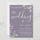 Unique eucalyptus violet poussiéreux et faire-part de mariage de lavande. Illustrations d'aquarelle originales en vert sauge et lilas avec calligraphie blanche. Facile à customiser avec vos propres informations.