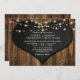Faire-part de mariage de tableau rustique personnalisé avec un coeur en damier et des lampes à cordes sur un arrière - plan en bois rustique. Personnalisez facilement cette carte de mariage rustique avec vos coordonnées de mariage.