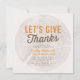 Célébrez votre dîner Thanksgiving avec une invitation rustique à dîner Thanksgiving. L'élégante invitation est complétée par une typographie vintage orange et marron qui dit "Let's Give Thanks", arrière - plan de bague en bois rustique, et texte personnalisé. Modifiez le style de police, la forme et bien plus encore pour créer un aspect personnalisé.
