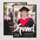 A graduation announcement and graduation party invitation in one! Show off your graduate's achievement with this bold typography graduation announcement with their photo in the spotlight, with Grad written in a bold white script in a modern style across the bottom of the photo. Personalize the custom text with the year, your graduate's name, the school they graduated from, and the degree they've gotten. Add the graduation celebration invite on the back of the card, beneath a second photo of the graduate. He did it! is written across the second photo, but as the text is editable, you can change it to She did it or They did it, depending on the pronoun of the graduate. The text is a stark white against a black background.
