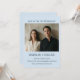 This wedding invitation features a full engagement photo at the top with the couple's names, date, venue, and RSVP details below on a soft blue background in clean bold lettering. Simple, modern, and photo-forward - a great fit for a couple who wants their picture front and center with a calm, understated color palette.