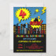 Boys Boom Comic Superhero 4th Birthday Invitation Bande dessinée colorée comme boys superhero quatrième anniversaire invitation avec un paysage urbain, une bombe, grand nombre d'âge et divers éléments de bande dessinée.