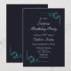 Une élégante invitation à la fête du 18e anniversaire, bleu nuit profonde et ornée de feuilles fleuries turquoise ornées de coins embellissés pour encadrer les détails de l'invitation.