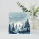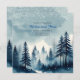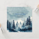 En el frente de la tarjeta, se representa un paisaje invernal pintado con suaves pinceladas de acuarela en tonos azules y grises. Un bosque de copos de nieve cayendo, con árboles esbeltos que se elevan hacia el cielo invernal. Tarjeta elegante para personalizar en esta temporada de invierno.
