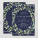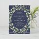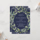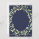 Cette élégante invitation de mariage présente un cadre géométrique moderne et argenté avec une couronne verte à la mode remplie de feuilles sur un arrière - plan bleu nuit.