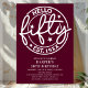 Célébrez un fabuleux 50ème anniversaire avec une invitation élégante qui présente une typographie blanche accrocheuse courageusement dressée contre un riche arrière - plan bordeaux. Le front annonce fièrement "Hello Fifty", invitant les invités à se joindre au plaisir. Personnalisez-le davantage en ajoutant votre année de naissance, ce qui en fait la vôtre. Au contraire, partagez tous les détails délicieux de votre fête, en vous assurant que tout le monde sait comment se joindre à la célébration de ce moment marquant !