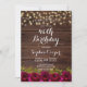 Rouge bordeaux rustique, roses marsala aquarelle, arrangement floral botanique design mariage avec feuilles verts et lumières à cordes sur bois de grange brun foncé. Dispose d'un élégant design de typographie manuscrite. Idéal pour une fête d'anniversaire adulte pour elle : 13ème 15ème 16ème 18ème 20ème 21ème 30ème 40ème 50ème 60ème 70ème 80ème 90ème 100ème, ou tout âge. Veuillez noter que ce design est un effet photo imprimé sans bois. #3348