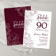 Maroon bordeaux et blanc surprise 90ème anniversaire invitation. L'élégante conception de vin de marsala féminine présente des accents botaniques et des caractères typographiques. Elégante carte invitation florale parfaite pour une célébration anniversaire surprise femme élégante. Invitations Zazzle imprimées ou téléchargement instantané modèle imprimable numérique.