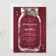 Faire-part de mariage bordeaux rustique sur mesure avec jarre de maçon et coeurs de burlap sur un arrière - plan en bois de grange. Personnalisez facilement ce faire-part de mariage de bocal de maçon avec vos détails mariages.