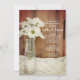Invités Invitations à la ferme rurale décontractée avant mariage en l'honneur de la mariée et mariée à être avec la charmante White Daisies dans Milk Bottle Farm Wedding shower Invitation. Cet Invitation à thème de ranch personnalisé décontracté présente une photo florale pittoresque d'une bouteille de lait en verre vintage remplie de fleurs marguerites blanches avec du satin blanc et un arrière - plan en bois de grange brun. Idéal pour une visite ou une idée pour un événement informel de fête de grange. Disponible sous forme d'invitation imprimée à l'envoi ou en téléchargement numérique pour un partage numériquement en ligne facile.