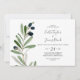 Cette faire-part de mariage horizontale à branche d'olivier moderne est parfaite pour un mariage boho. Le design rustique et élégant présente des feuilles botaniques et des olives noires d'aquarelle simple sur une petite branche à l'atmosphère méditerranéenne classique.