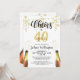 Célébrez un 40e anniversaire (ou n'importe quel âge) avec cette invitation à l'anniversaire de CHEERS TO 40 ans en noir et or avec des vedettes d'or en banderoles de guirlandes et boisson festive. Typographie manuscrite moderne et bouteilles de champagne, vin ou bière. Idéal pour les anniversaires adultes pour lui ou elle. Contactez le concepteur via Zazzle Conversation ou makeitaboutyoustore@gmail.com si vous souhaitez modifier ce design, sur un autre produit ou pour coordonner des éléments.
