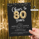 Célébrez un 80e anniversaire avec ces invitations de fête élégantes et festives avec le titre CHEERS TO 80 YEARS avec des numéros de ballon en or métallique et typographie de script moderne et confetti dans votre choix de couleur arrière - plan (montré en noir). ASSISTANCE : Pour obtenir de l'aide sur la modification ou la personnalisation de la conception, le transfert de la conception à un autre produit ou si vous souhaitez coordonner des éléments, contactez le concepteur AVANT de commander par Zazzle Conversation ou par courriel makeitaboutyoustore@gmail.com.