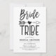 Cartes d'invitation à une réception de mariage personnalisées pour votre tribu de mariée spéciale. Il présente un thème classique en noir et blanc avec les mots bride tribe écrits dans une police de style manuscrit. Entre les deux mots se trouve une flèche tribale perçant un cœur.