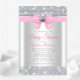 Invitation baby shower rose et argent avec joli arc diamant rose et argent sur un élégant arrière - plan diamant bling. Cette invitation baby shower en bling-bling rose et gris est facilement customisée pour votre événement.