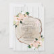 Une tranche de bois rustique avec un spray floral roux dans le coin Invitation à Christening. Personnalisez facilement vos informations de fête.