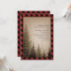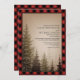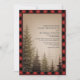 Faire-part de mariage rustique avec une illustration au fond d'arbres à feuillage persistant sur un arrière - plan brun. La bordure et l'envers sont rouges et noirs plaid de buffle.