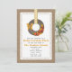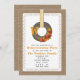 Une invitation à la fête de réchauffement avec une illustration d'une couronne monogrammée sur le thème de l'automne. La couronne de rosettes rouges, jaunes et orangées est suspendue à un ruban de chevron orange. Arrière - plan inspiré par burlap. Personnalisez la couronne avec la lettre de votre initiale. Personnalisez le texte avec les détails de votre occasion.