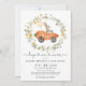 Allez-y pour un brunch de Pâques et chasser les oeufs ! Invitation vos invités à votre fête avec cette invitation super adorable avec un lapin mignon chevauchant une voiture carotte encadrée d'une luxuriante couronne fleur sauvage.