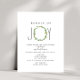 Une invitation au baby shower d'hiver neutre avec l'expression "Bundle of Joy" avec l'illustration d'une couronne verte incorporée à la lettre à la place d'un "O". Le côté opposé présente un design en feuilles vertes. Customisez le texte avec les détails de votre occasion.