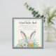 Un coussin mignon avec des oreilles de lapin surgissant des fleurs de printemps. Invitation virtuelle.