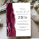 The left-hand edge of this elegant modern wedding anniversary party invitation features a burgundy red watercolor agate border trimmed with silver faux glitter. The customizable text combines charcoal gray handwriting, copperplate and italic fonts on a white background. The reverse side features a matching burgundy and silver agate design.
