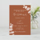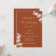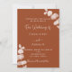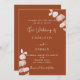 Arrière - plan orange foncé, décoré de tiges d'eucalyptus, sprigs. Personnalisez et ajoutez vos noms et les détails. Dos : arrière - plan orange brûlé foncé. Ajoutez l'URL de votre site Web mariage au code QR pour que vos invités puissent rechercher plus de détails/RSVP