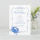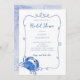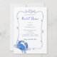 Le crabe d'aquarelle dans les tons bleus avec cadre de doodle bleu poussiéreux de la plage invitation les invités à un événement ludique sur le thème côtier. La typographie manuscrite jumelée à une police serif classique distinctive rassemble des fantaisies et des classes dans une ambiance de plage décontractée. Élégance sans être farfelu ou surfait, juste amorcé pour le plaisir! La carte revient à un arrière - plan d'aquarelle bleu artistique lavé, en complément du motif de crabe d'aquarelle de l'avant.