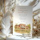 Invitation vos invités à une belle célébration avec ce charmant faire-part de mariage aquarelle, présentant le Café Brauer historique dans le Lincoln Park de Chicago. L'oeuvre d'art capte de manière exquise l'architecture de style Prairie de l'édifice, avec ses accents de brique rouge-marron/terre cuite et de toit vert (notamment le grand auvent), magnifiquement reflétés dans l'eau tranquille de l'étang ou du lagon adjacent. La scène est entourée d'arbres luxuriants, dont les feuilles se dépeignent dans les tons verts, jaunes dorés et marron clair, évoquant une ambiance de fin d'été ou de début d'automne. Rendu dans un style aquarelle doux et accueillant, cette invitation est parfaite pour les couples à la recherche d'un cadre élégant mais naturel pour leur mariage de Chicago. L'avant présente élégamment vos détails mariages, tandis que l'arrière offre "The Finer Details" pour les informations des clients, tout en conservant l'oeuvre pittoresque. La palette de couleurs comprend des tons chauds rougeâtres, des terracottas, des verts variés, des jaunes dorés, des marron clair et des tons d'eau douce.