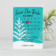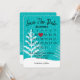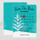 Calendrier "Save the Date" avec cœur rouge sur fond aqua avec flocons de neige et arbres pour mariage à venir.