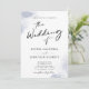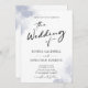 Tout en un QR Code RSVP Chic Moderne Calligraphie Noire Dusty Blue Aquarelle Faire-part de mariage... Notre faire-part de mariage de lavage à l'aquarelle bleu poussiéreux, à la tendance épurée, propose un script de calligraphie moderne combiné à un texte serif et sans serif pour un faire-part de mariage simple et chic. Le verso de l'invitation affiche également votre code QR de site Web mariage ainsi que l'URL du site lui-même permettant à vos invités de facilement RSVP en ligne et de voir tous les détails normalement envoyés dans un paquet mariage. L'exemple de modèle graphique de code QR et tous les exemples de texte (mis à part les éléments de calligraphie graphique) peuvent être facilement révisés avec vos propres informations sur le modèle de personnalisation.