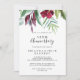 Cette invitation d'anniversaire de mariage tropical calligraphié est parfaite pour une célébration rustique d'anniversaire de mariage. Ce design enchanteur peint à la main présente de précieux éléments de couleur bordeaux, des fleurs violettes et du feuillage vert soigneusement disposés en bouquets élégants.