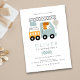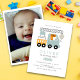 Cute petit dino's au travail dans camion de construction, Impressionnez votre invité par cet invitation d'anniversaire mignon et extraordinaire, Customisez avec la photo de votre petit pour rendre cette invitation spéciale
