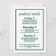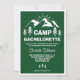 Invitation de bachelorette camp vert et blanc avec montagnes et arbres forestiers. Le dos peut être personnalisé avec les événements de fin de semaine ou l'itinéraire pour une plage de destination, les informations RSVP et les détails du registre.