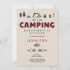 Un modèle simple, moderne, élégant et chic invitation à la fête de bachelorette avec un thème de camping, avec plaid rouge sur le titre "camping", le camping dessiné à la main et des icônes en plein air (camp de feu, marshmallows, tente, lampe, etc.) avec une texture moderne et en détresse. Un beau choix pour un week-end bachelorette de camping amusant, randonnée ou n'importe où en plein air.