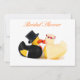 Mariée et marié canards en caoutchouc s'embrasser. Top chapeau et queues avec guirlande de rose rouge. Faire-part de mariage ou carte mignonne qui peut être customisé avec votre propre texte, noms, date et images.