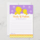 Cette jolie carte de sagesse aux mots amusants présente un adorable canard jaune et canard en bulles de bain savonneuses blanches sur un arrière - plan violet clair avec un ruban orange et des rayures jaunes. Le texte combine écriture manuscrite et polices sans serif pour un look élégant et moderne. C'est parfait pour un Baby shower.