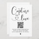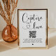 Capturez le panneau Love mariage dispose d'un script de calligraphie moderne avec des accents cardiaques, jumelé avec un code QR personnalisé et des instructions de numérisation simples pour vos invités mariages. Les couleurs noir et blanc peuvent être modifiées.