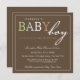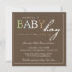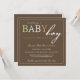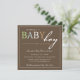 Cette belle invitation de baby shower comporte les mots "bébé" aux nuances de garçon sur un arrière - plan de brun foncé.