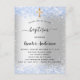 Pour une invitation élégante et baptisée. Un arrière - plan faux argenté. Décoré de confettis bleu clair et d'une croix dorée. Personnalisez et ajoutez un nom et des détails. Écriture de style manuscrit moderne