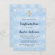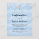 Pour une confirmation, célébrer un garçon. Un faux arrière - plan bleu à l'allure métallique. Décoré avec de la poussière de parties scintillant en faux bleu. Personnalisez et ajoutez le nom et les détails. Le nom et la confirmation sont écrits avec un script de style manuscrit