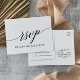 Cette élégante carte postale RSVP demande une chanson de calligraphie blanche et noire est parfaite pour un mariage simple. Le design neutre présente une carte minimaliste décorée de typographie romantique et fantaisiste. Créez votre liste d'invités mariages et votre liste de chansons de piste de danse tout à la fois ! Cette carte postale de réponse mariage demande si les invités pourront assister à votre mariage, et aussi quelle chanson les amènera à danser.
