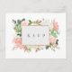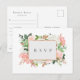 Cadre doré élégant avec fleurs aquarelles et feuillage de couleur verte, blanche, or rose, rose et rose pétale, demande de RSVP de mariage avec demande de chanson, carte postale. Personnaliser le texte, personnaliser le style de police, la couleur et la taille.