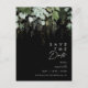 Nous avons conçu cette carte postale d'invitation "save the date" à l'écriture de feuilles dorées et de verdure sur fond noir pour compléter votre mariage bohème simple et élégant. Elle présente des feuilles de eucalyptus vertes et blanches modernes, du feuillage de fougère, une fleur de succulente et des feuilles en feuille d'or minimalistes. Ces éléments donnent l'impression d'une forêt enchantée aquarelle fantaisiste, parfaite pour tout mariage rustique et bohème ! N'hésitez pas à la personnaliser pour qu'elle soit vôtre ; n'hésitez pas non plus à parcourir le reste de la collection pour trouver des produits assortis et coordonnés !