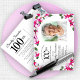 De beaux panneaux roses et blancs sont nichés dans des feuilles vert foncé. Célébration du 100e anniversaire et nom de la personne est écrit dans un grand texte rouge. Il y a plus de place sur le dos de la carte postale pour créer un message spécial à vos invités. Tout le texte peut être modifié. Un choix idéal pour un anniversaire spécial de printemps ou d'été.