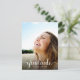 Une carte postale moderne d'invitation à la fête de remise de diplômes avec la photo de la grade superposée avec "gradué" dans un script blanc branché avec des swashes et leur nom et leur année de classe en lettres blanches simples. Au verso, ajoutez une photo supplémentaire et les détails de votre fête.
